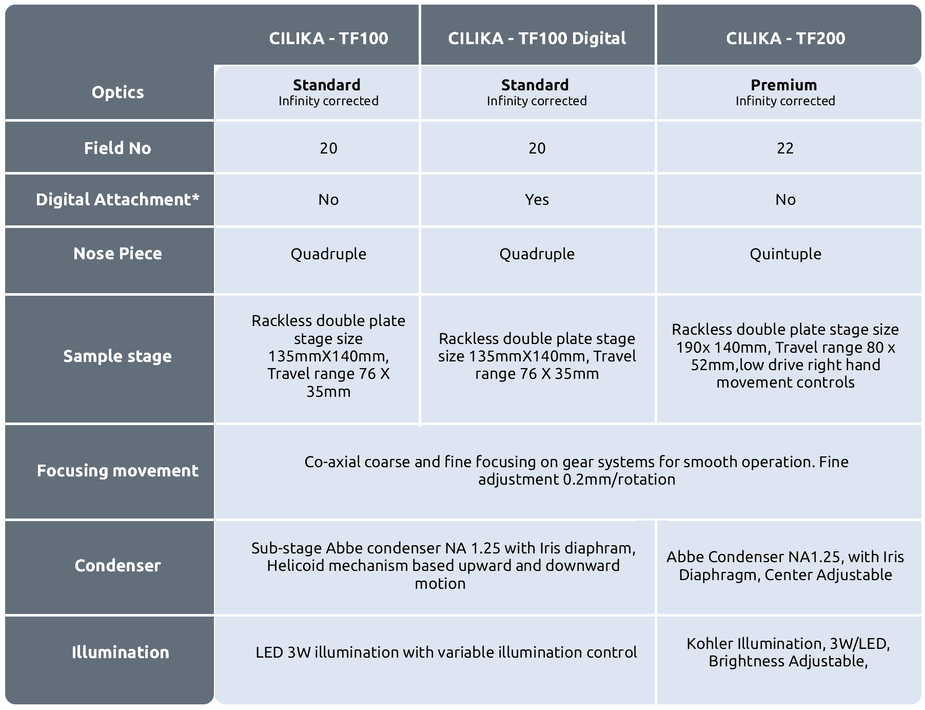 Cilika Digital Microscopes have finite and Infinity Corrected plan achromat Lenses installed in the specific models.
